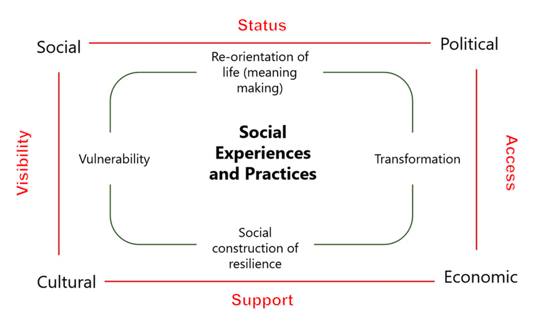 A social phenomenon characterized by vulnerable individuals’ or groups’ social experiences and social practices in the face of political, economic, cultural, and social (PECS) environmental changes and challenges. Individuals or groups going through this experience learn to re-examine their lives in the new context and shape their adaptive and transformational capabilities (Qamar, 2023)